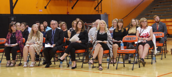Chester High School Curriculum Director Shirley Stegmann came to the podium to recognize Steve Colonel for his 31 years of service and dedication to CHS. Mr. Colonel will be retiring at the end of the school year.