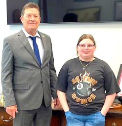 Senator Henderson greets Marcie Hartle, from Leasburg, Missouri, who was visiting the Capitol with her grandmother, Emily Lewis