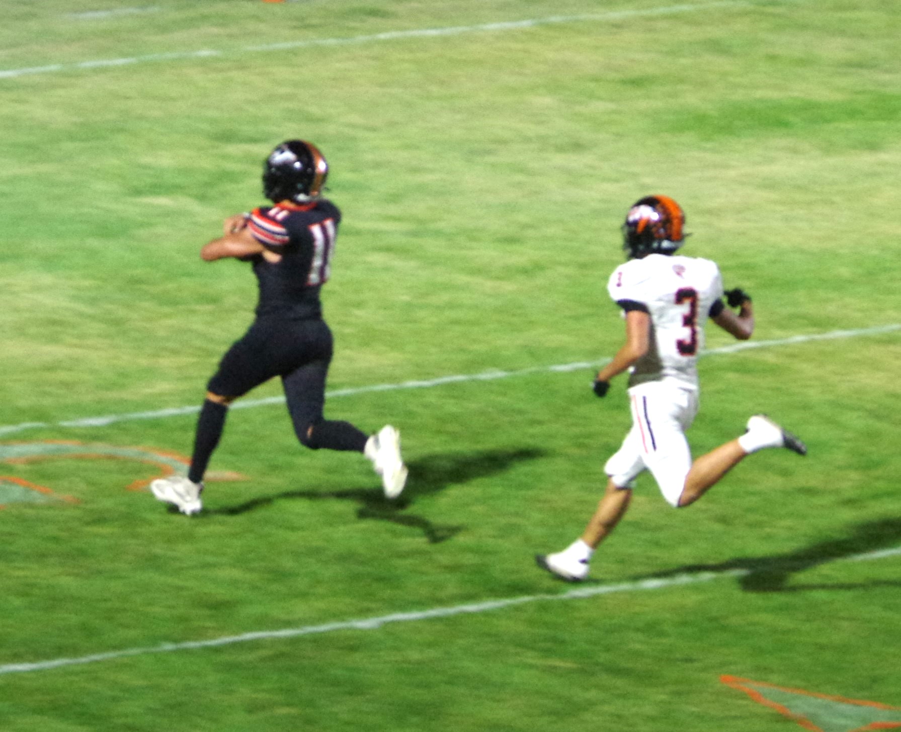 TaShawn Palacio (11) scores his second of four touchdowns vs Wesclin Friday September 26. The TD was the result of a second 51-yard pass reception thrown by Chester quarterback Tray Peters at the 11:42 mark of the 2nd quarter. In this photo Wesclin’s Christian Lopez (3) gives up after chasing Palacio for 50 yards to no avail. Jim Beers Photo