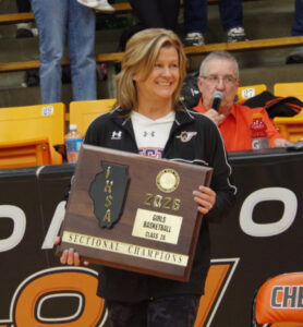 Jenny Cartwright, Chester High School Athletic Director, presents the Championship Plaque to the Breese Central Lady Cougars. Brese had just defeated the Nashville Lady Hornettes, 58-48, in the 2026 Championship game of the Class 2A Chester Sectional Tournament. Behind Cartwright is CHS Stadium Announcer Mike Lochhead making the official announcement that the Cougars are the 2026 Sectional Champions. Jim Beers Photo