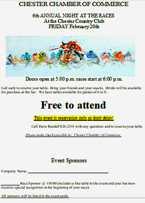 CHESTER – Join the Chester Chamber of Commerce Friday, February 20th for our 6th Annual Night at the Races at the Chester Country Club!!
