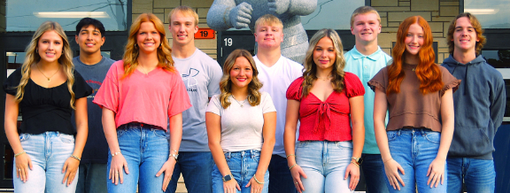 (Back Row, left to right) are junior King Candidate Karim Landeros, senior King Candidates Ethan Colvis, Brayden Juenger, and Tray Peters, and junior King Candidate Zane Eggemeyer. (Front Row, left to right) are Queen Candidate junior Aleah Eggemeyer, senior Queen Candidates, Maggie Caby, Callie Davis, and Camryn Wolff, and junior Queen Candidate Aubrey Colvis. Jim Beers Photo