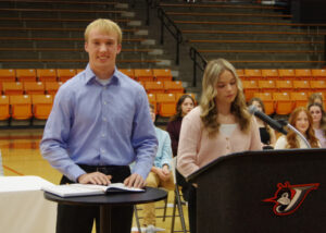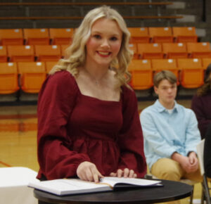 At this point in the induction ceremony, NHS President, Camryn Wolff returned to the podium at conduct the actual Induction Ceremony. Wolff said, “Candidates, we ask that you now rise, raise your right hands, and recite the NHS pledge. The audience may follow along with the printed text in your program.”