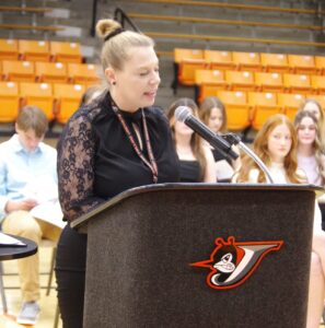 Paula Ray, one of the Co-Sponsors of Chester High School’s Summit Chapter of the National Society, welcomes guests to the 2025-26 Induction Ceremony for 22 new members of the NHS. The event took place Wednesday November 12 at CHS Colbert Gymnasium. Mrs. Ray guided the ceremony as Co-Sponsor Evely Hankins was unable to be present at the event. Jim Beers Photo