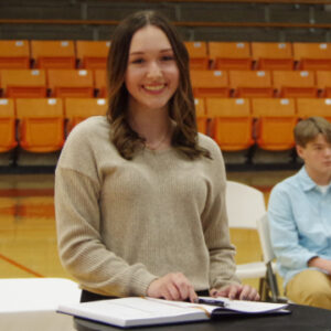Chester High School student, Joella Eggemeyer, signs the Official Register of the Summit Chapter of the National Honor Society after taking the oath and making the pledge to join the organization. The event was the 2025-26 Induction Ceremony of the NHS at CHS. Jim Beers Photo