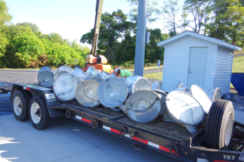 Pictured are the old and outdated halogen lights that have been removed from W.O. Smith Field at Chester High School.  All four banks of lights at the field have been replaced with much brighter and more economical LED lighting. The new lights premiered Friday night September 26 when the YellowJackets hosted the Wesclin Warriors  Jim Beers Photo