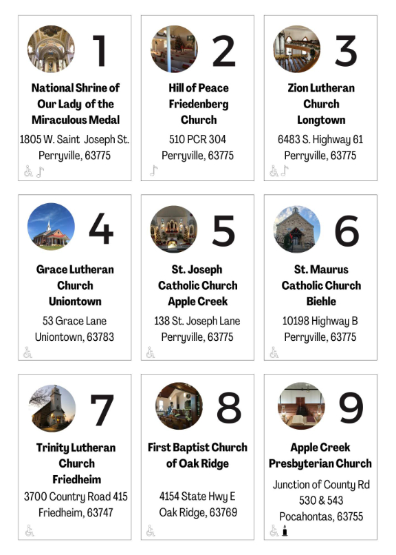 Many of the churches will have music and some are handicapped accessible. Look for the symbols on in their photo below.