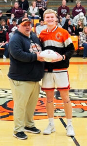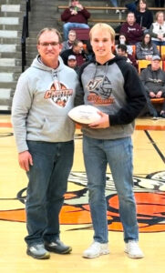 CHS Head Football Coach, Billy Belton presents CHS senior quarterback, Tray Peters, with a commemorative football for his record-breaking 2025 season. Peters set two school records, one for Most Passing Touchdowns (25), and the other for best Passing Completion Percentage (65%).