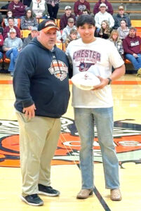 Head Chester Football Coach, Billy Belton, presents Karim Landeros, a junior, with a commemorative football, for his record-breaking 2025 season at CHS. Landeros set a new record for Single-Season Punting with 40.6 Yards Per Punt. In addition, Karim set a second record of 98 PAT’s, the All Time Leader in PATs at Chester High School.