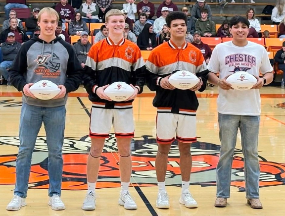 All four Chester High School Record-Breakers for the 2025 CHS YellowJacket Football Season include (left to right) Ethan Colvis, Tray Peters, TaShawn Palacio, and Karim Landeros. All four were recognized and honored at a special ceremony Friday February 6 at a Chester High Schol basketball game when Chester hosted Red Bud. All four are holding their commemorative footballs they received from CHS Head Coach Bill Belton at the ceremony.
