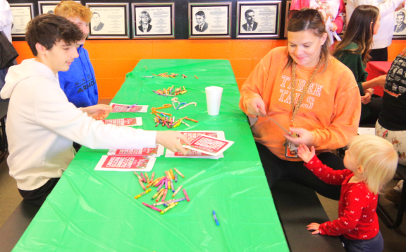 The entire area of the Dr. Sharp Cafeteria was filled with activity stations for the entertainment of the children. At one station kids could color Christmas pictures. Another station had Bingo games which awarded small prizes to the winner.