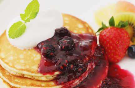 - Build a stack of pancakes and then pour the warmed blueberries (with juice) on top.