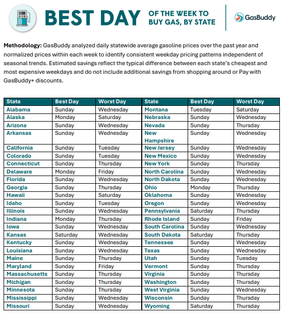 GasBuddy analyzed daily statewide average gasoline prices over the past year and normalized prices within each week to identify consistent weekday pricing patterns independent of seasonal trends. Estimated savings reflect the typical difference between each state’s cheapest and most expensive weekdays and do not include additional savings from shopping around or Pay with GasBuddy+ discounts.