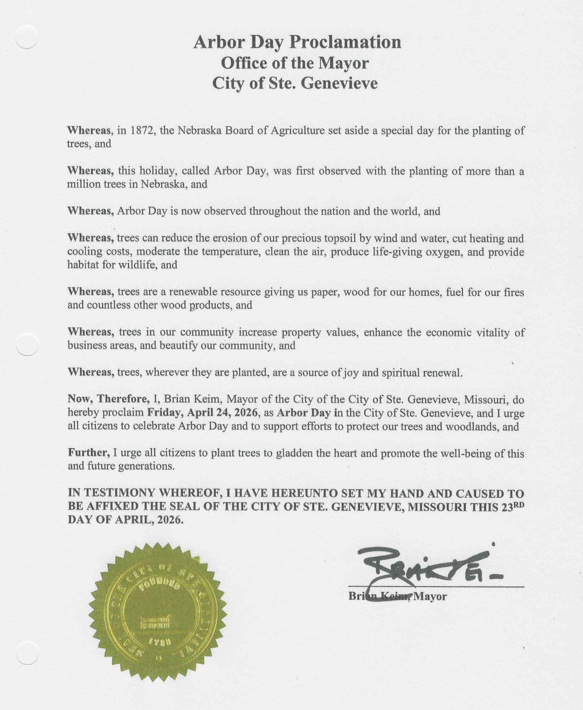 Steiger read a proclamation for Arbor Day and presented a Mayoral Merit Award to the Master Gardeners and Downtown Ste. Genevieve.