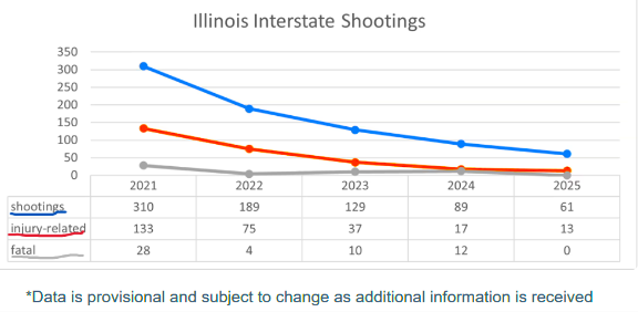 SPRINGFIELD – For the fourth year in a row, the number of shootings on Illinois interstates has dropped. The Illinois State Police (ISP) is reporting interstate shootings statewide decreased 31% in 2025, compared to 2024, with zero fatal interstate shooting in Illinois. This is the first time in roughly a decade there has been zero interstate shooting fatalities.