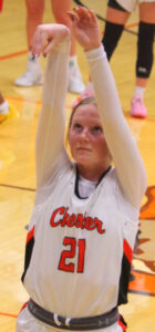 Chester’s Lillian Diskey (21) finishes her free throw attempt in the first half of the CHS vs Massac County game Saturday January 3. For the night Diskey was 2-for-4 (50%) from the free throw line, and she scored in double figures (11) in with 50-35 win over the Lady Patriots of Massac County. Jim Beers Photo