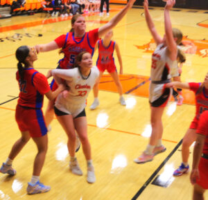 Lady Jacket Jessica Stumpe (24) had a great night rebounding and going after loose balls in the 50-35 win over the Massac County Lady Patriots Saturday January 3. In this photo Stumpe battles against Patriots Lydia McCraw (50), Kenna Hight (24) and Sadie Kaylor (13). Jim Beers Photo