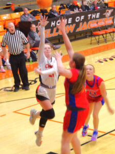 In that winning frame, both Aubrie Coleman and Lexi Mott scored four points apiece. Coleman had two field goals and Mott had a field goal and two free throws. Sophomore Marlie Caby knocked down a trey for three points. Jessica Stumpe added a traditional two-point field goal, and Lillian Diskey made a free throw to round out the Lady Jacket’s 14 points.