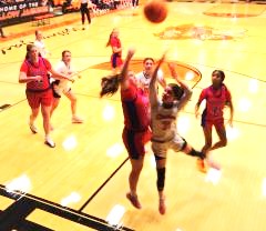 Aubrey Coleman (31) goes hard to the basket off of a coast-to-coast fast break drive Saturday January 3 against Massac County. For the night Coleman was one of two top scorers for Chester with 16 points. Coleman recorded five 2-point field goals and a pair of important 3-pointers. Shown here Coleman goes up against the tallest player on the court, No. 50, Lydia McCraw. Jim Beers Photo