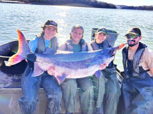 MDC staff (l-r) Jaida Kettner, Brie Cranor, Jessa Chapmon, and Carson Rees captured, tagged, and released this 118-pound paddlefish from Table Rock Lake in January. Information gathered from returned tags will help paddlefish management.