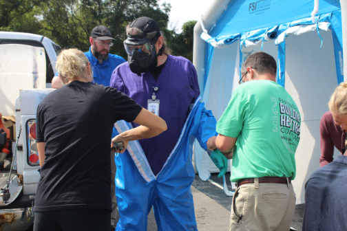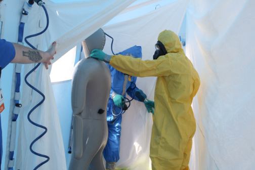 A key component of the training involved mastering the use of specialized protective suits, including correct procedures for donning and doffing. Staff also practiced patient decontamination techniques using Memorial Hospital’s decontamination tent and equipment, gaining valuable experience in a controlled, realistic setting.