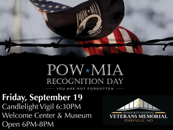 PERRYVILLE, Mo. – Missouri’s National Veterans Memorial invites the public to participate in a special Candlelight Vigil Friday, September 19, 2025, at 6:30 p.m. to honor and remember America’s Prisoners of War and those who are Missing in Action.
