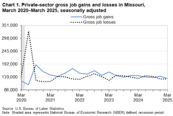• Gross job gains represented 5.4% of private sector employment in Missouri in the first quarter of 2025, compared to the national rate of 5.6%.