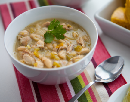 2. Stir in shredded chicken, white beans, green chiles, chicken broth and spices. Bring to a simmer. Reduce heat to medium-low and simmer for 15–20 minutes, stirring occasionally, to let flavors meld.
