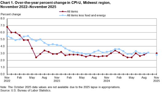 KANSAS CITY — The Consumer Price Index for All Urban Consumers (CPI-U) in the Midwest region increased 3.0 percent for the 12 months ending in November, the U.S. Bureau of Labor Statistics (BLS) reported today. The index for all items less food and energy rose 2.8 percent over the year, and energy prices advanced 6.4 percent. Food prices increased 2.3 percent.