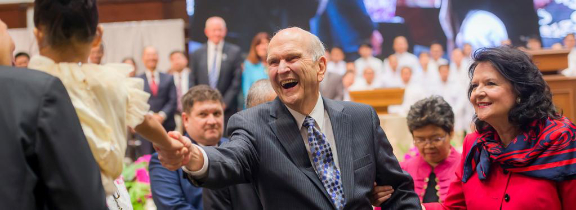President Russell M. Nelson, his wife, Wendy, and Elder Gary E. Stevenson of the Quorum of the Twelve Apostles, greet Latter-day Saints in Peru for an evening devotional October 20, 2018.2018 by Intellectual Reserve, Inc. All rights reserved.