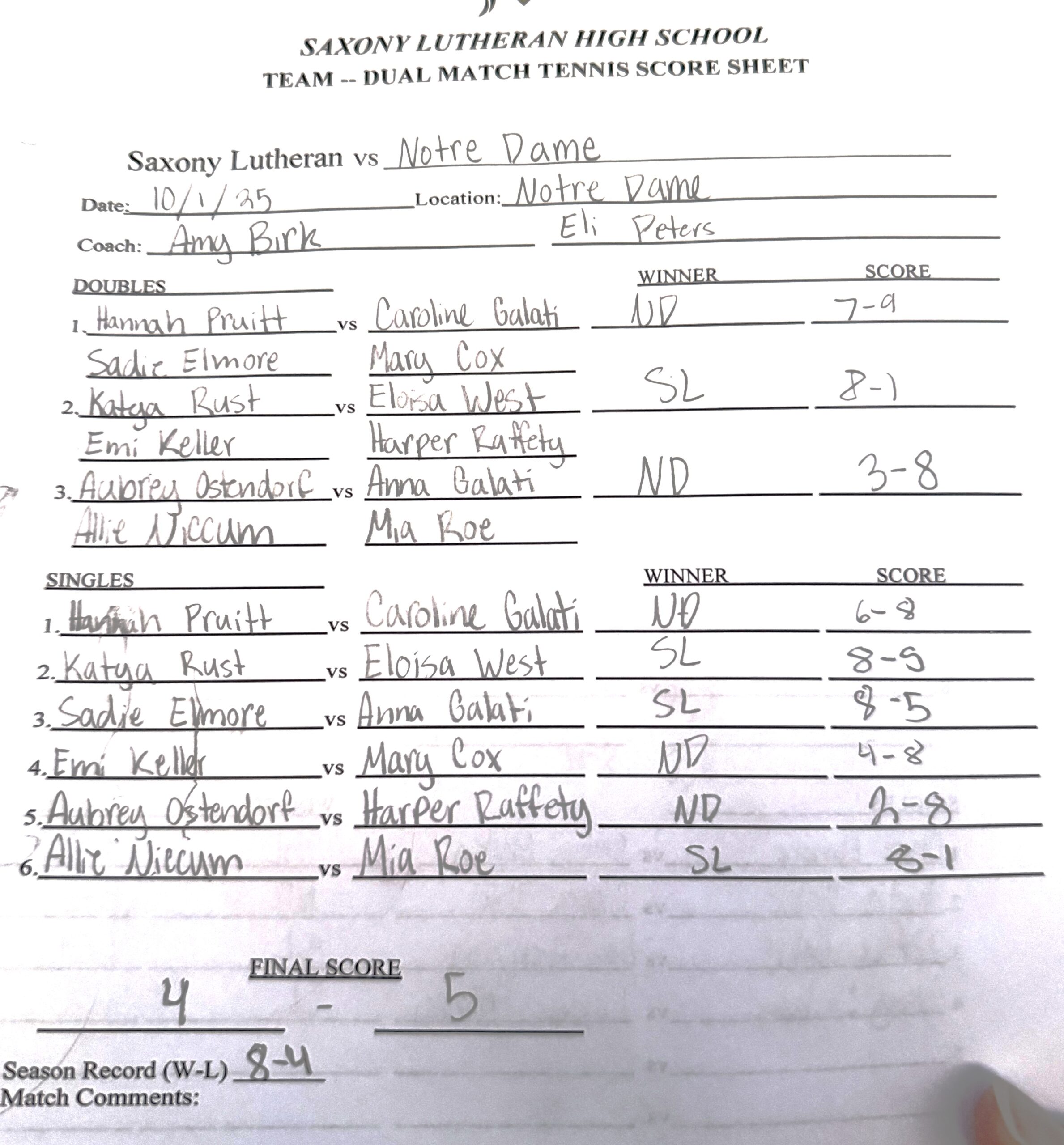JACKSON — Saxony Lutheran Tennis lost at Notre Dame (Cape) 4-5.