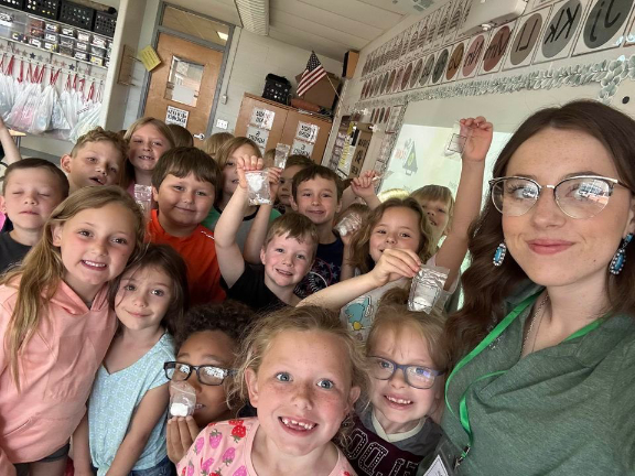 Collegiate educator, Kaelyn Winters, poses with students following a successful Soybean lesson.