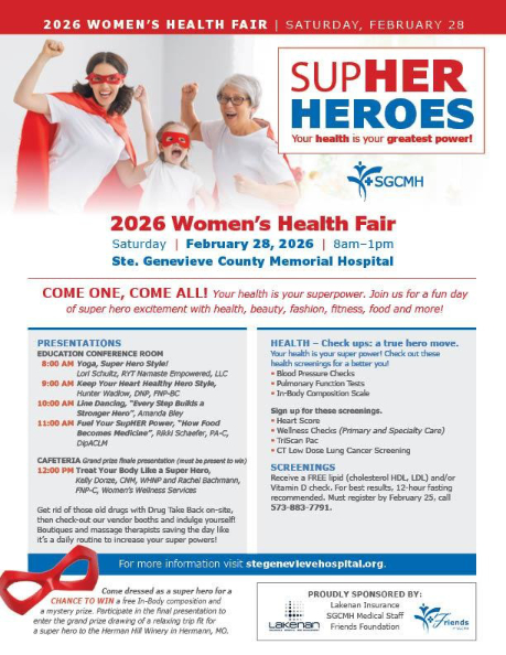 STE. GENEVIEVE, MO. – Ste. Genevieve County Memorial Hospital (SGCMH) is gearing up for its 27th annual Women’s Health Fair scheduled for Saturday, February 28, from 8 a.m. to 1 p.m. The theme for this year’s event is “SupHER Heroes, Your Health is Your Greatest Power!”