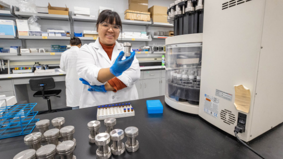 Cristina La, who recently earned her master’s degree from SIU Carbondale, shows off samples in the lab. (Photo by Russell Bailey).