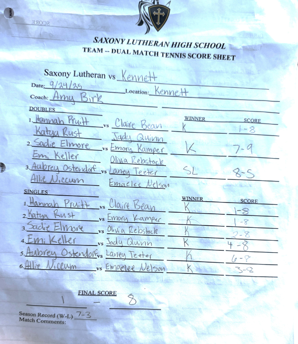 SLHS tennis falls at Kennett / Sports JACKSON – Saxony Lutheran Tennis lost at Kennett.Please see attached for details. The Crusaders play at SEMO against Potosi for senior night on Monday.