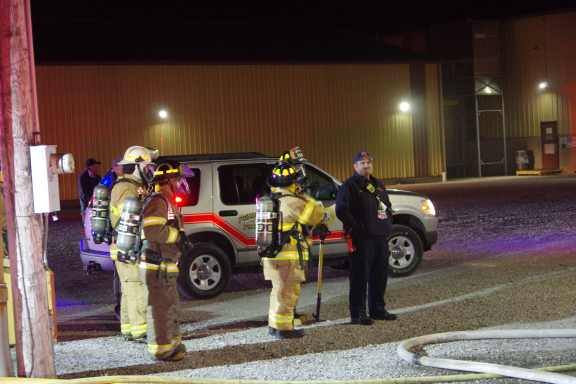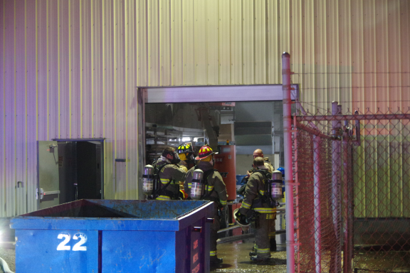 Fire department personnel appeared at the entrance of the box plant ready to enter the building, however had not made entry at that point.