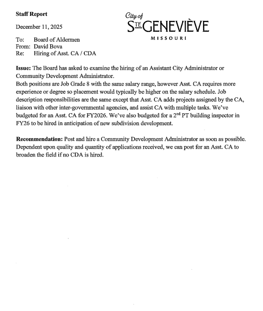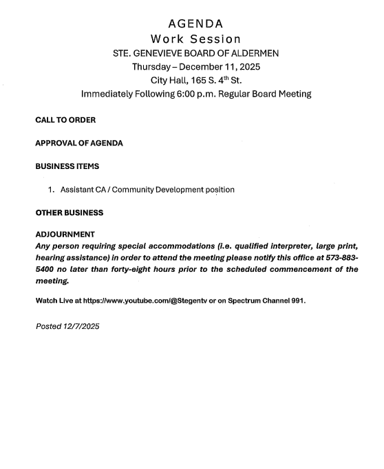 STE. GENEVIEVE – The tentative agenda for the Ste. Genevieve Board of Aldermen work session to be held immediately following the 6 p.m. Thursday, December 11, 2025 regular board meeting has been released.