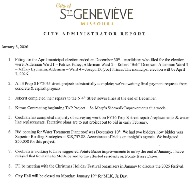 STE. GENEVIEVE – The Ste. Genevieve Board of Aldermen met in regular session Thursday, January 8, 2026 for its first meeting of the new year. All of the aldermen were present for the meeting with the exception of Teddy Ross, who did not attend.