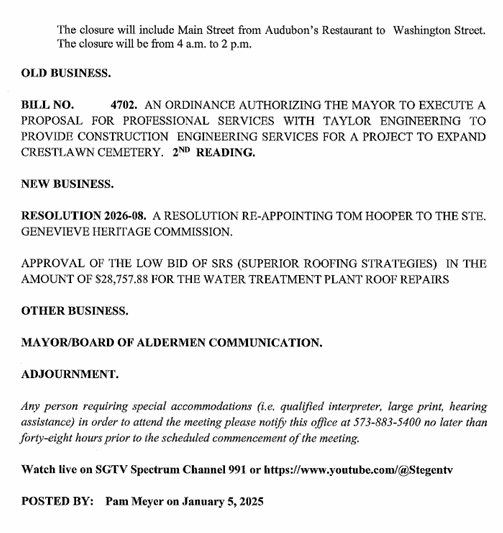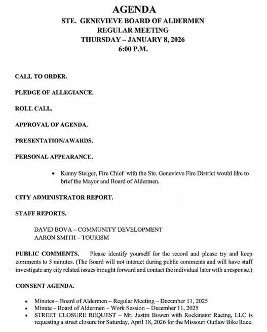 Ste. Genevieve Board of Aldermen meets Thursday / News, Ste. Genevieve News STE. GENEVIEVE – The Ste. Genevieve Board of Aldermen will meet at 6 p.m. Thursday for its first regular session of the new year. The meeting is open to the public. The tentative agenda: The complete agenda packet: SG BOA AGENDA PACKET 010826