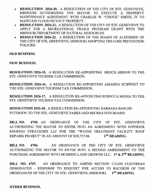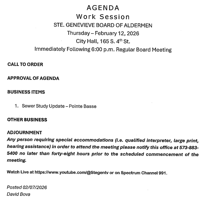 STE. GENEVIEVE – The Ste. Genevieve Board of Aldermen will meet in regular and work sessions Thursday beginning at 6 p.m. in the city hall board room.