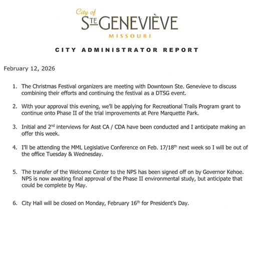 City Administrator David Bova’s report to the board: