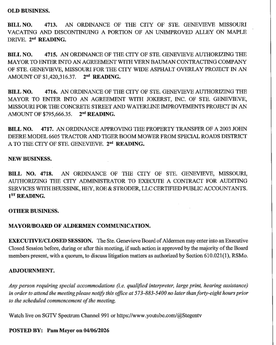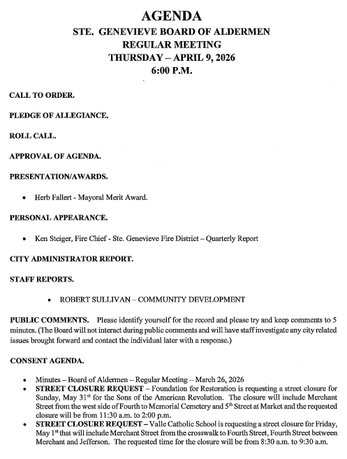 STE. GENEVIEVE – The Ste. Genevieve Board of Aldermen will meet Thursday at 6 p.m. in the city hall board room.
