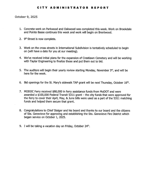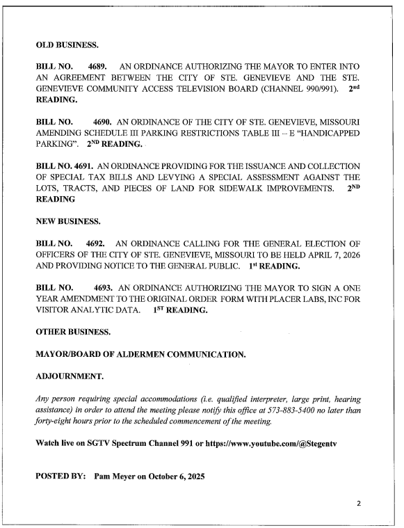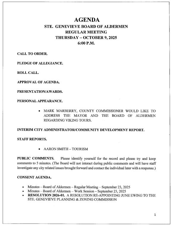 Both the regular meeting and the work session are open to the public and will be shown live on SteGenTV Channel 991 on the Spectrum Cable System in Ste. Genevieve and globally on the SteGenTV You Tube channel.