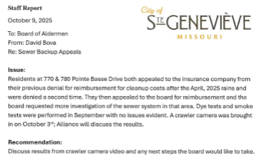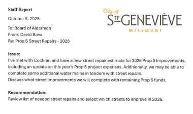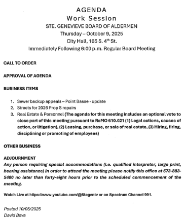 Ste. Genevieve Board of Aldermen Work Session agenda released / News, Ste. Genevieve News STE. GENEVIEVE – The tentative agenda for the Thursday, October 9, 2025 Board of Aldermen Work Session has been released. The work session begins immediately following the regular Board of Aldermen meeting which begins at 6 p.m. in the city hall board room. Both meetings are open to the public. The tentative work session agenda:
