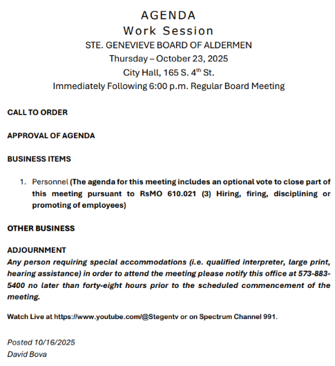 STE. GENEVIEVE – The tentative agenda has been released for Thursday’s Board of Aldermen work session.