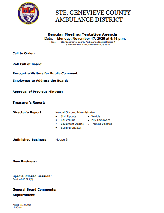 Ste. Genevieve County Ambulance District board meets Monday / News, Ste. Genevieve News STE. GENEVIEVE – The Ste. Genevieve County Abulance District board will meet in regular session Monday, November 17 at 5:15 p.m. in the Ste. Genevieve County Ambulance District House 1, 3 Basler Drive in Ste. Genevieve. The tentative agenda: