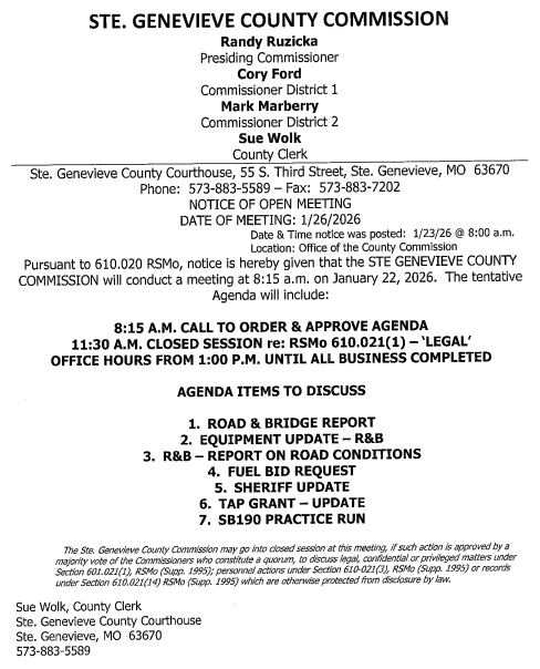 Ste. Genevieve County Commission meets this morning / News, Ste. Genevieve News STE. GENEVIEVE – The Ste. Genevieve County Commission will meet in regular session this morning at 8:15 a.m. in the Ste. Genevieve County Courthouse. The meeting is open to the public. The tentative agenda: