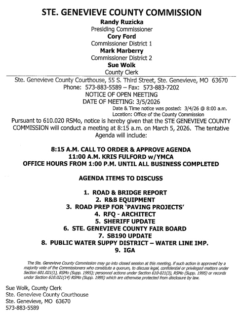 Ste. Genevieve County Commission meets this morning