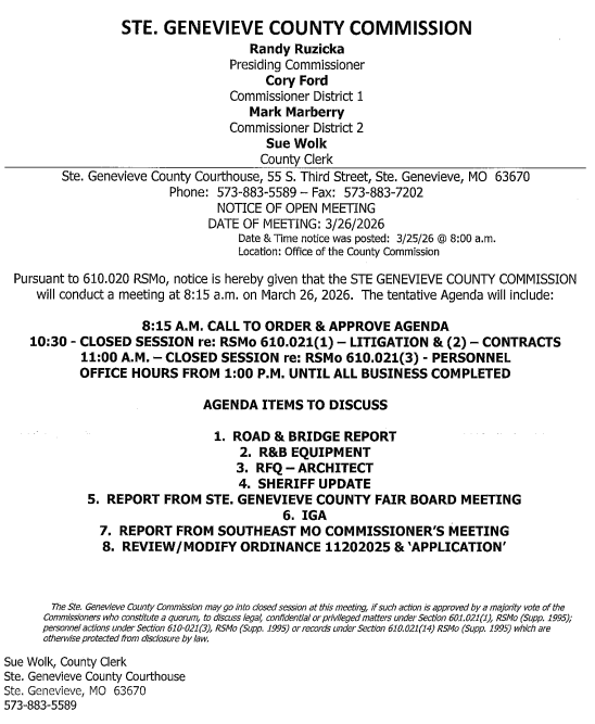 STE. GENEVIEVE – The Ste. Genevieve County Commission will meet this morning at 8:15 a.m. in the Ste. Genevieve County Courthouse.
