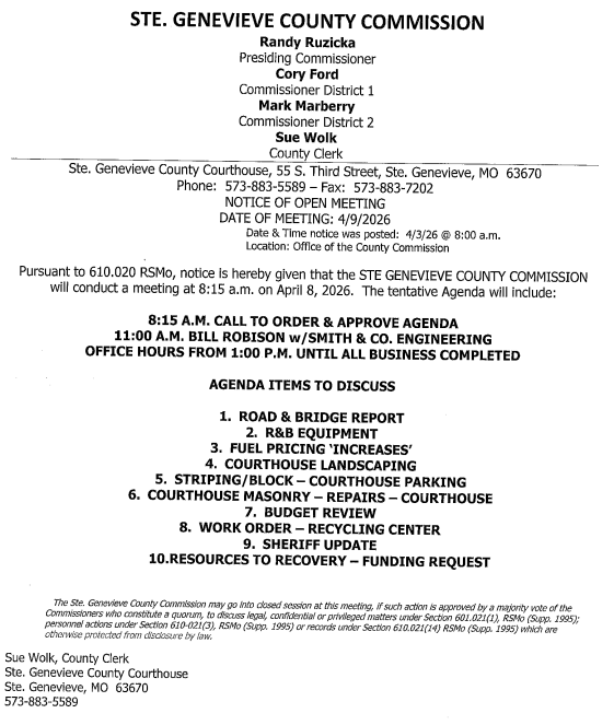 Ste. Genevieve County Commission meets this morning / News, Ste. Genevieve News STE. GENEVIEVE – The Ste. Genevieve County Commission will meet at 8:15 a.m. today in the Ste. Genevieve County Courthouse. The meeting is open to the public. The tentative agenda: